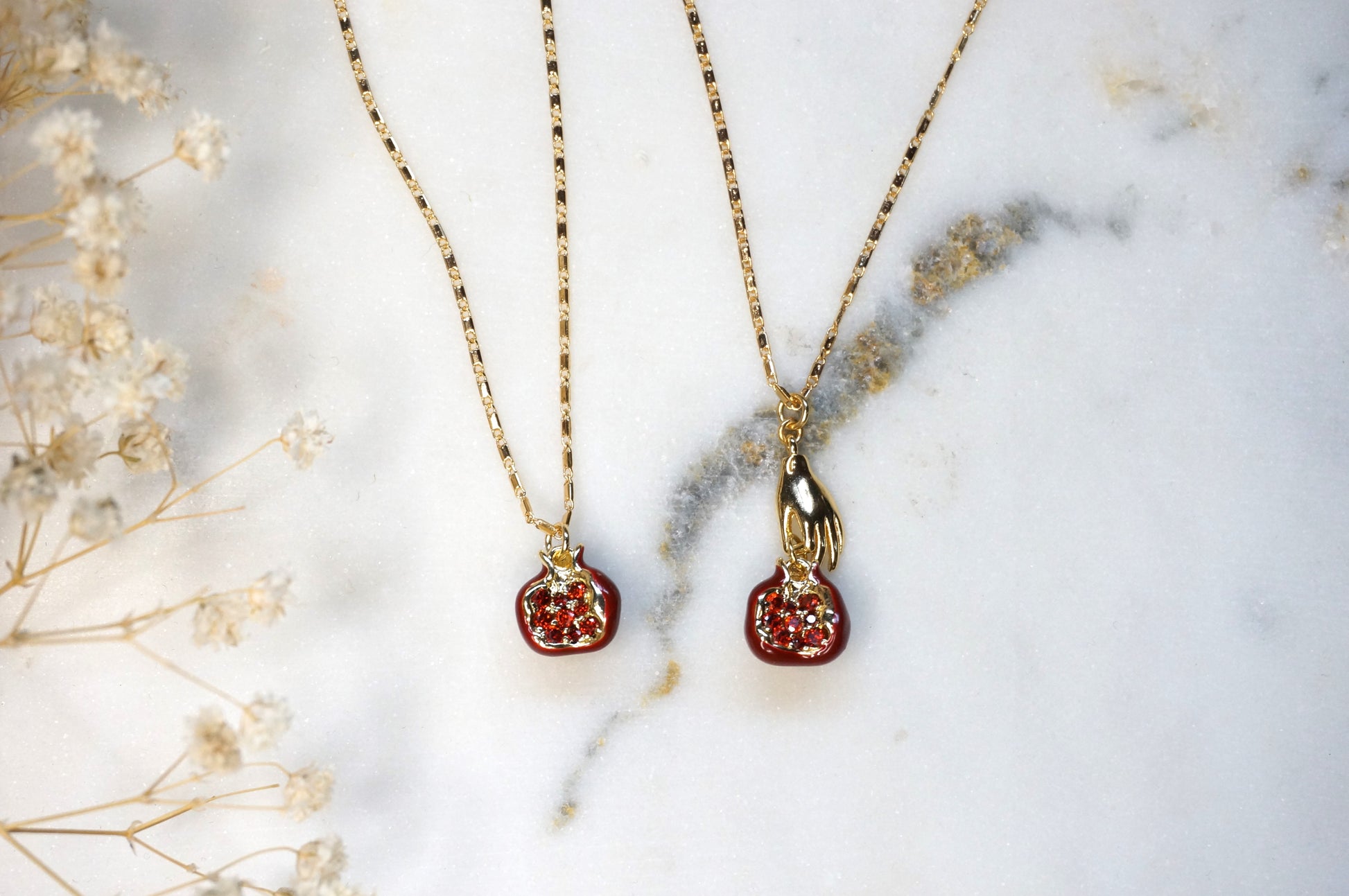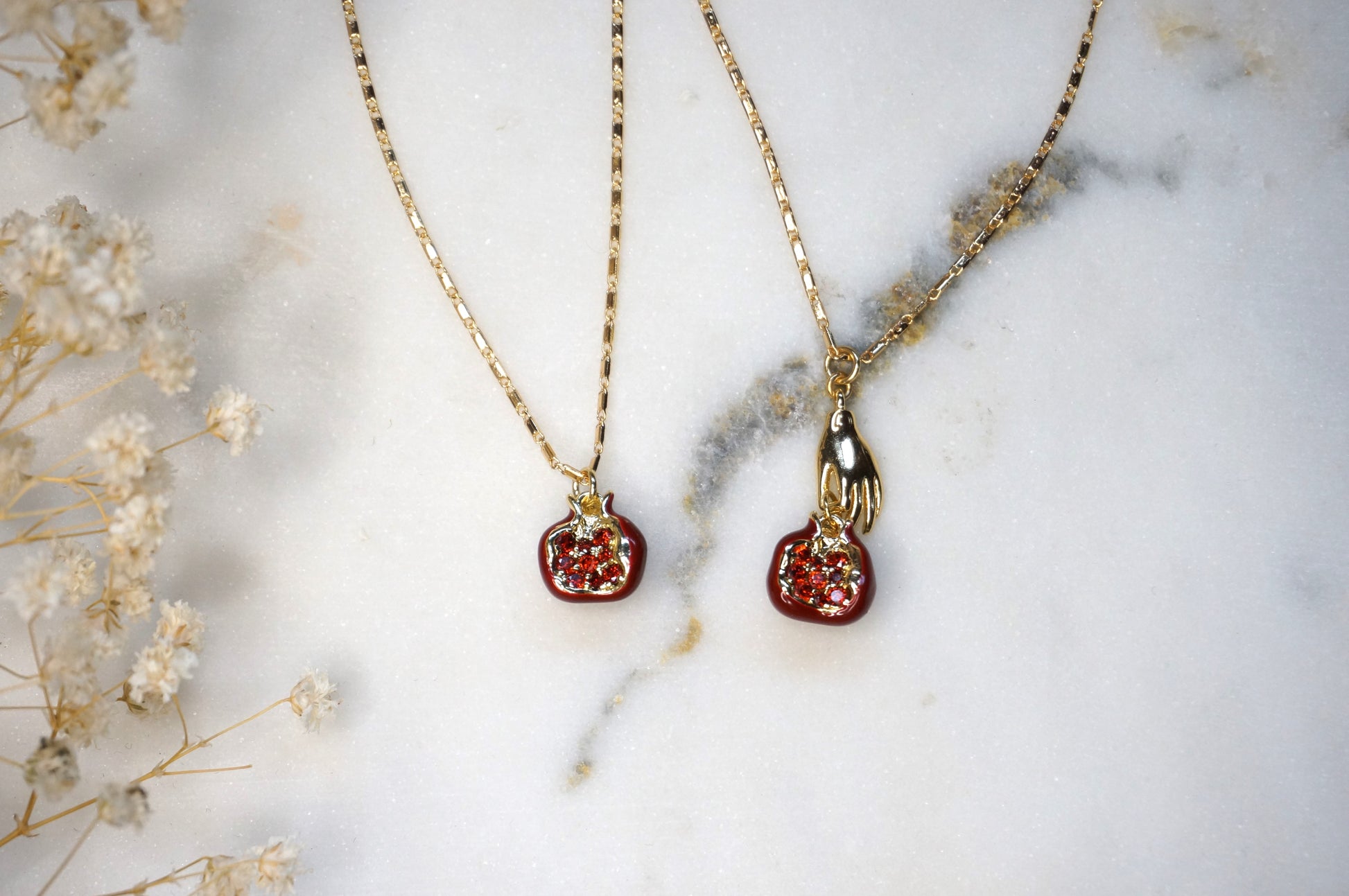 These hypoallergenic necklaces consist of pomegranates made of 18K Gold and red enamel plating, which have the option to be held by 18K gold plated brass dainty hands, and a 45cm chain that has a extra 5cm extender.