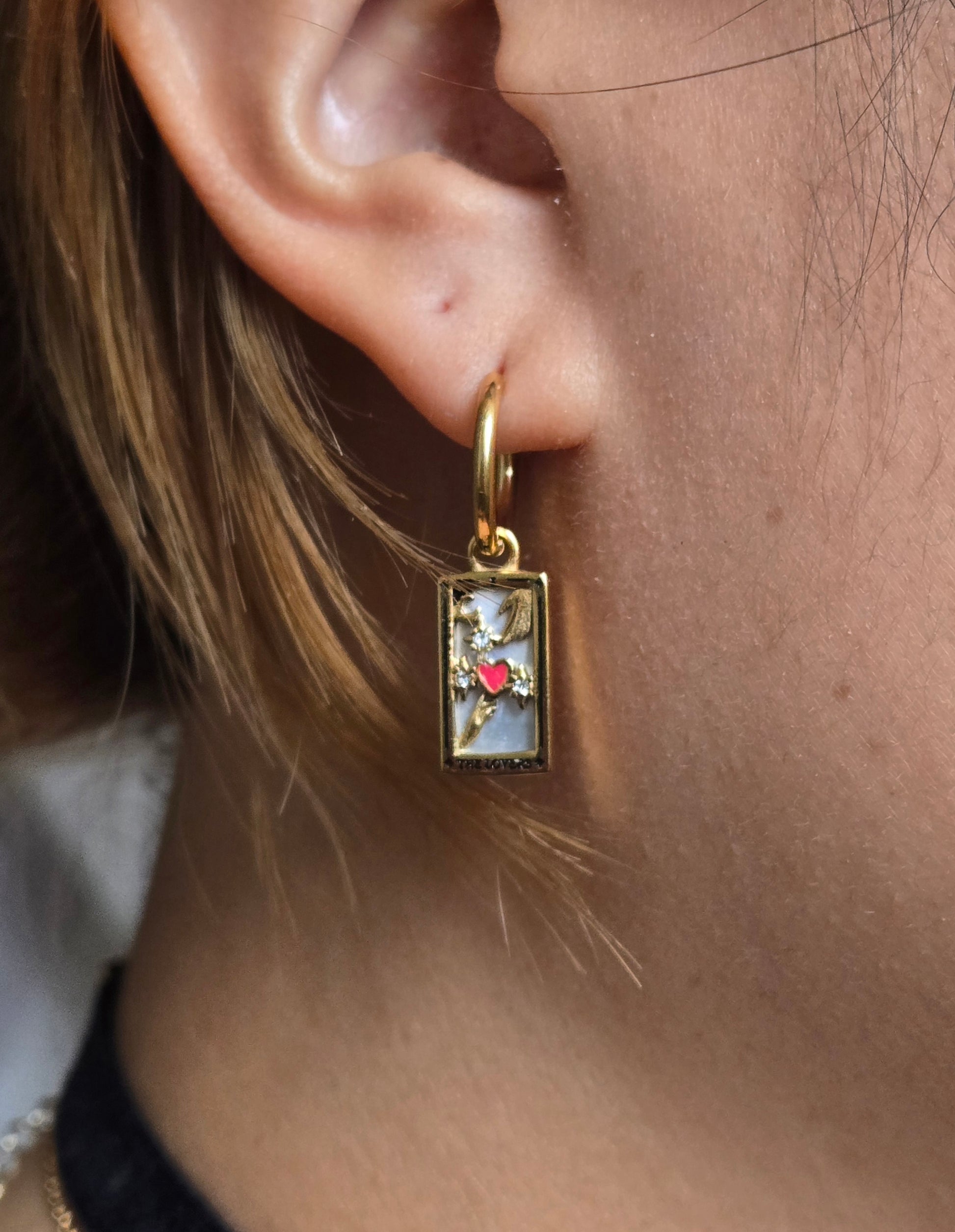 Pearlescent dainty tarot card huggies that have three important cards from the tarot cards on, wear your favourite tarot card with you at all times.