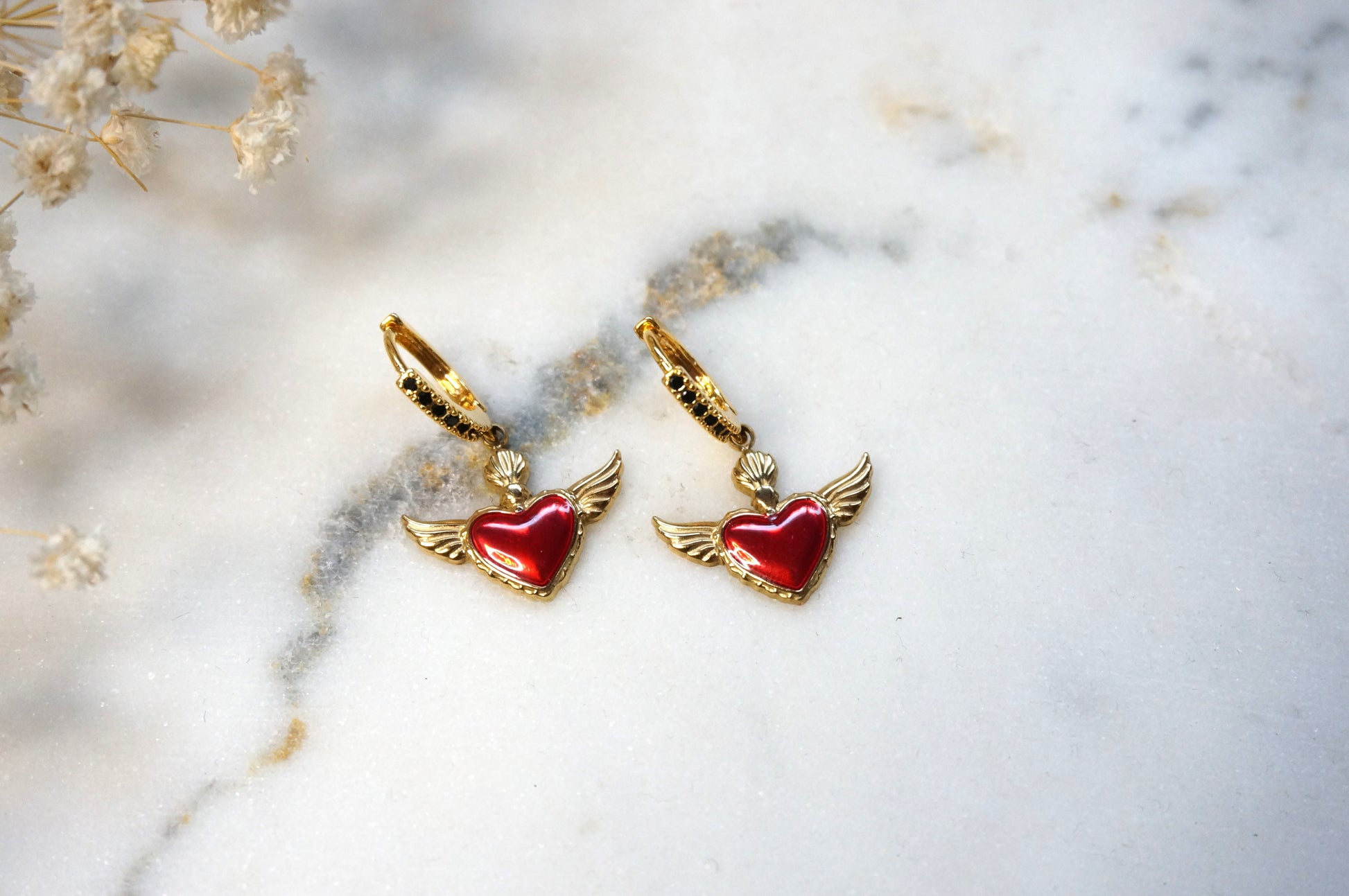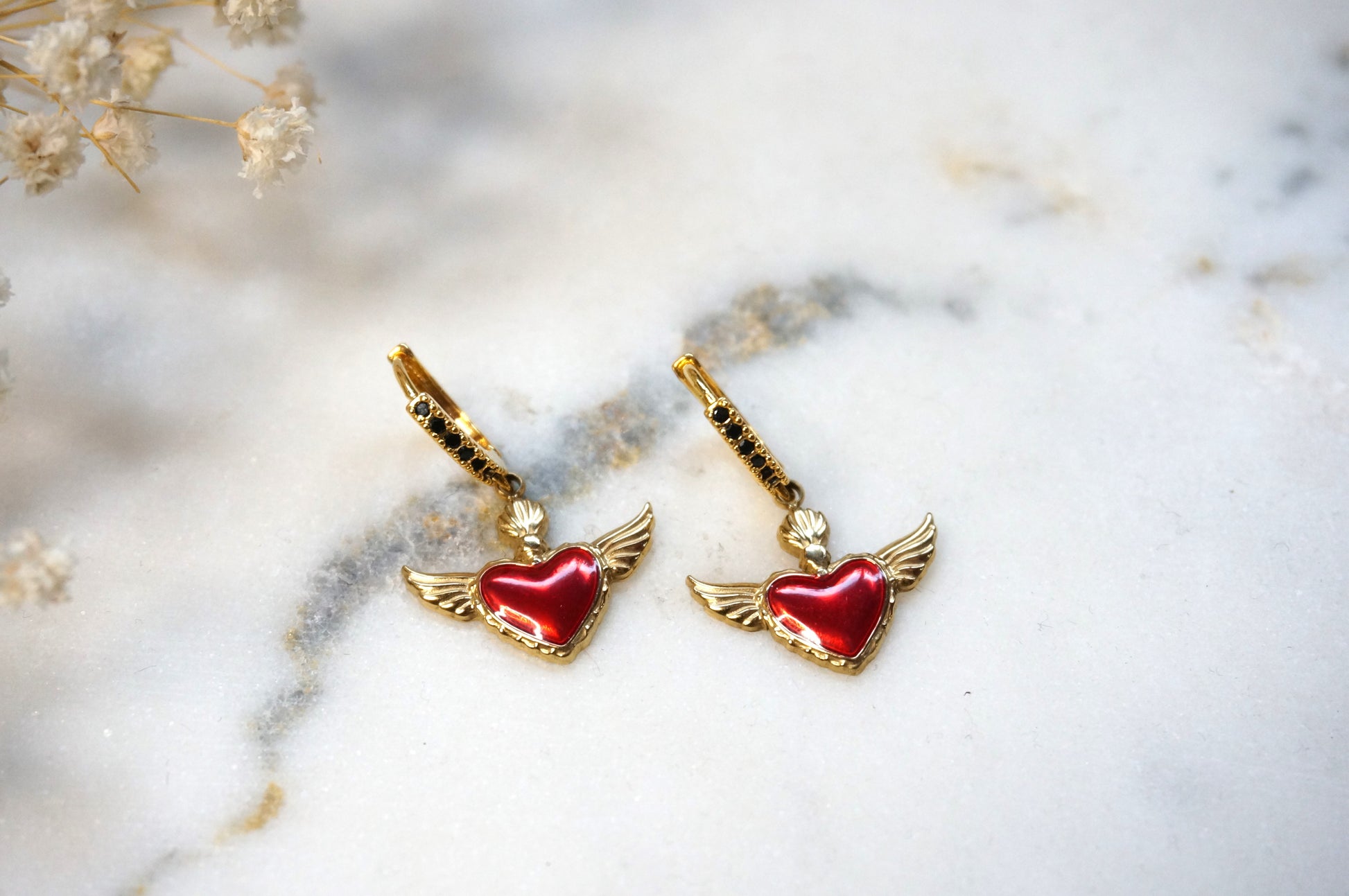 These earrings consist of red winged hearts, made out of enamel and stainless steel, measuring 2cm x 1.5cm, placed onto gold hoops with black encrusted cubic zirconia measuring 1.4cm x 1.2cm.
